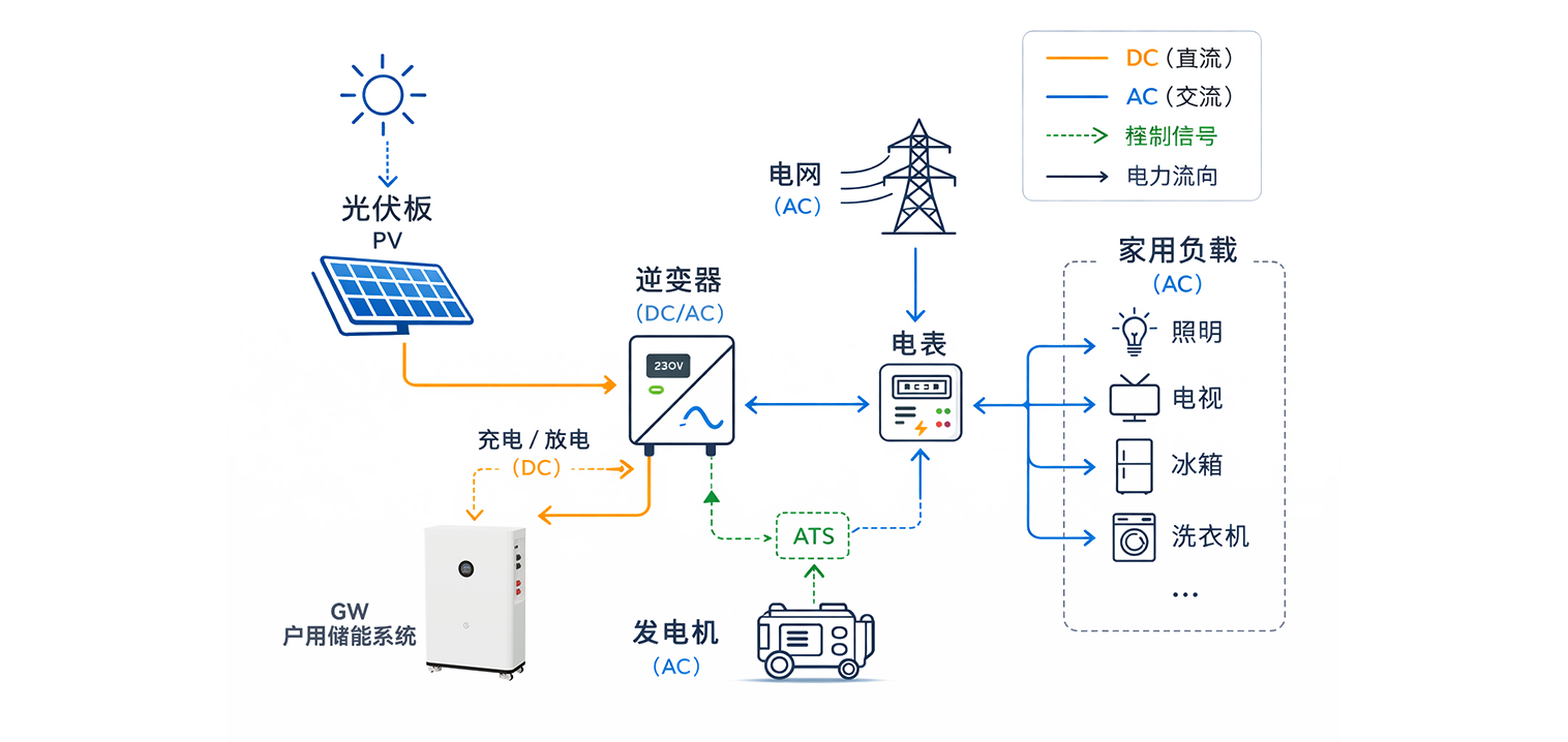 GW系列户用储能系统可灵活适配光伏逆变器,支持光储一体化设计,并通过本地控制与云平台(中英文)实现智能运维,助力家庭用户降低用电成本、提升用电可靠性。